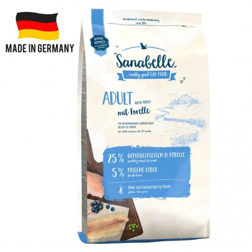 Sanabelle Adult with Trout (Форель) — полностью сбалансированный высококачественный сухой корм для взрослых кошек всех пород. Данный корм, предназначенный для кошек в возрасте старше одного года с достаточно малой подвижностью.